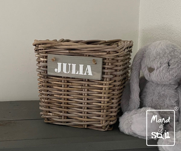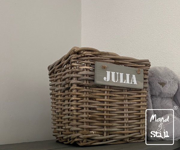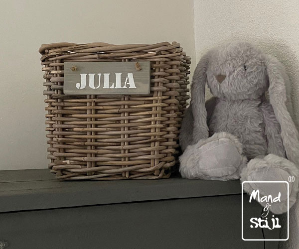 Wilt u een naam op het bordje laten schilderen? Of wilt u de mand zonder bordje bestellen? Gebruik de keuzelijst!